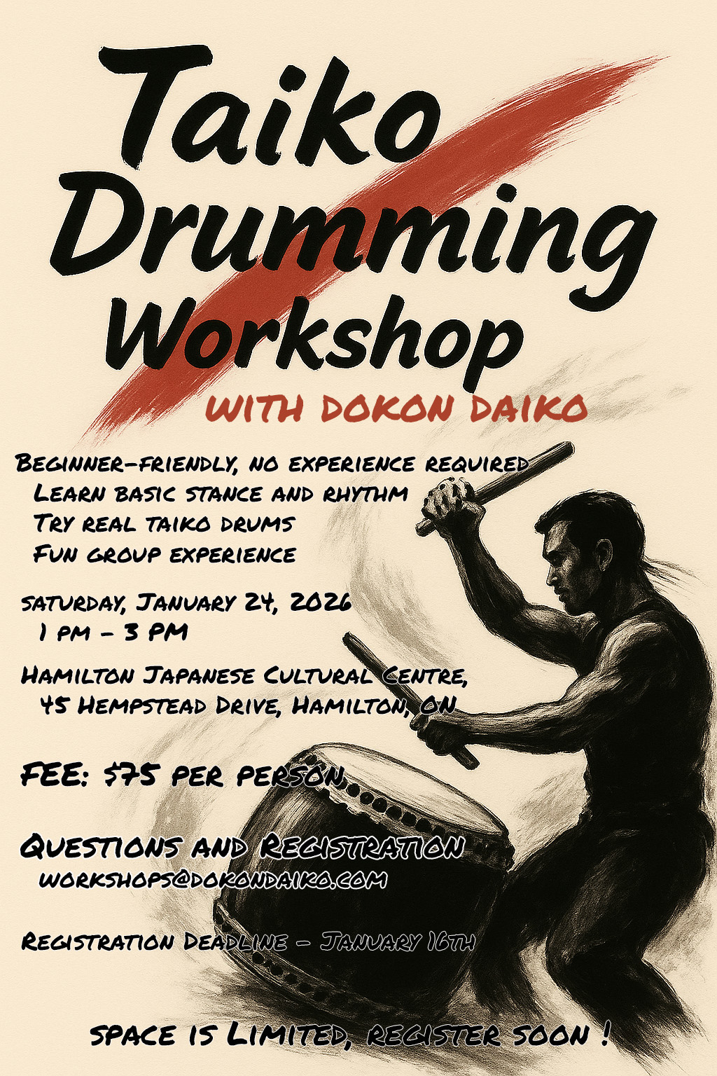 Join us for an exciting drumming workshop at the Hamilton Japanese Cultural Centre on January 24 in Hamilton, Ontario. This two-hour, beginner-friendly workshop is designed for those who want to try drumming for the very first time. Participants will explore the energy, rhythm, and cultural significance of Japanese drumming through guided instruction and hands-on practice.